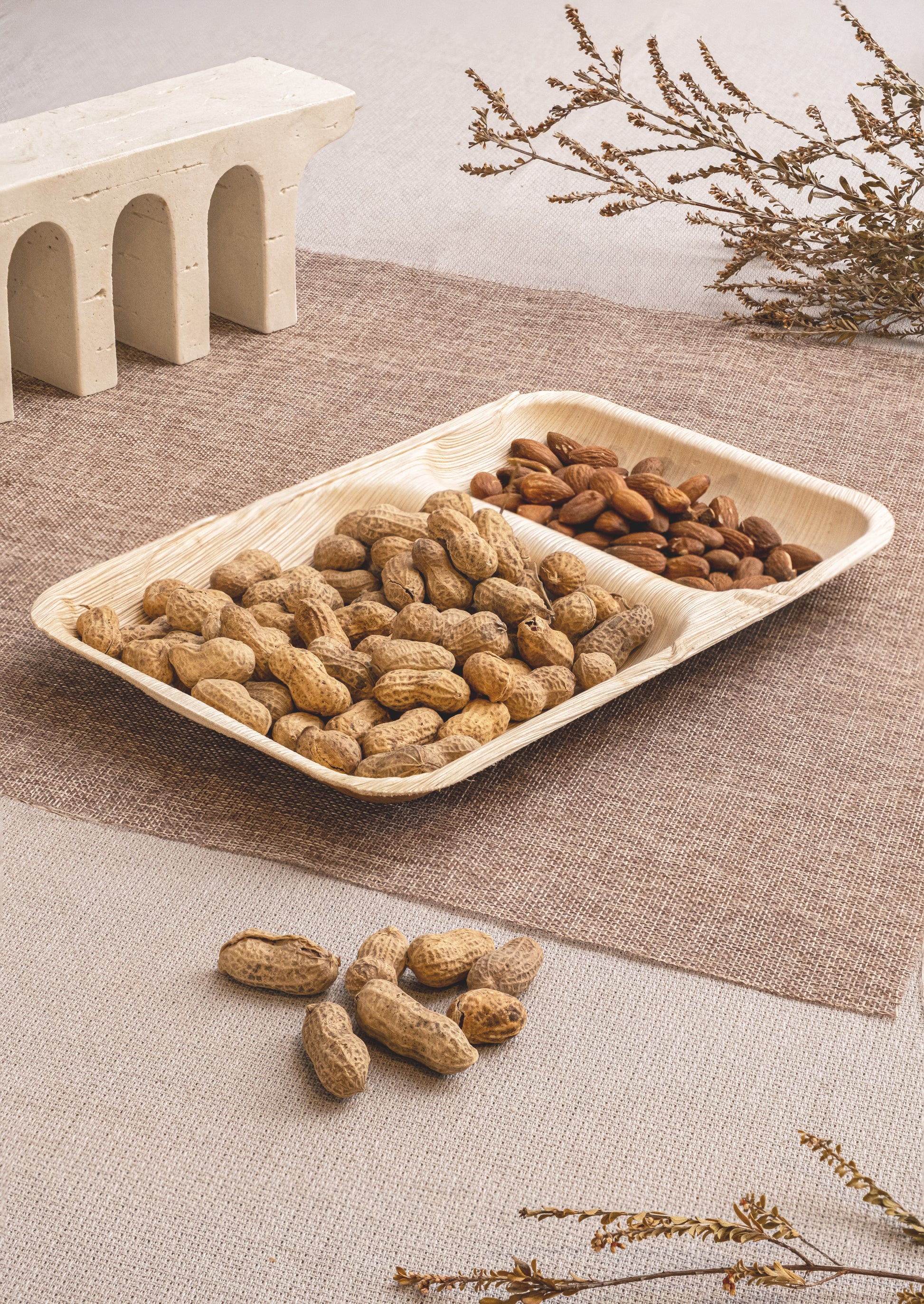 Eco-consciousness at its best! Our Areca Nut Leaf Divided Plate is the sustainable and eco-friendly choice for you! Say goodbye to plastic and Styrofoam with disposable and compostable options made from naturally fallen leaves!