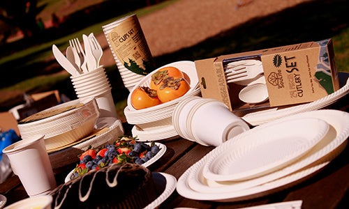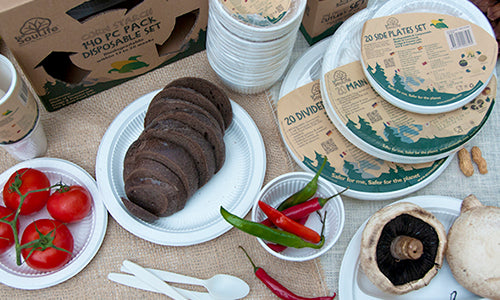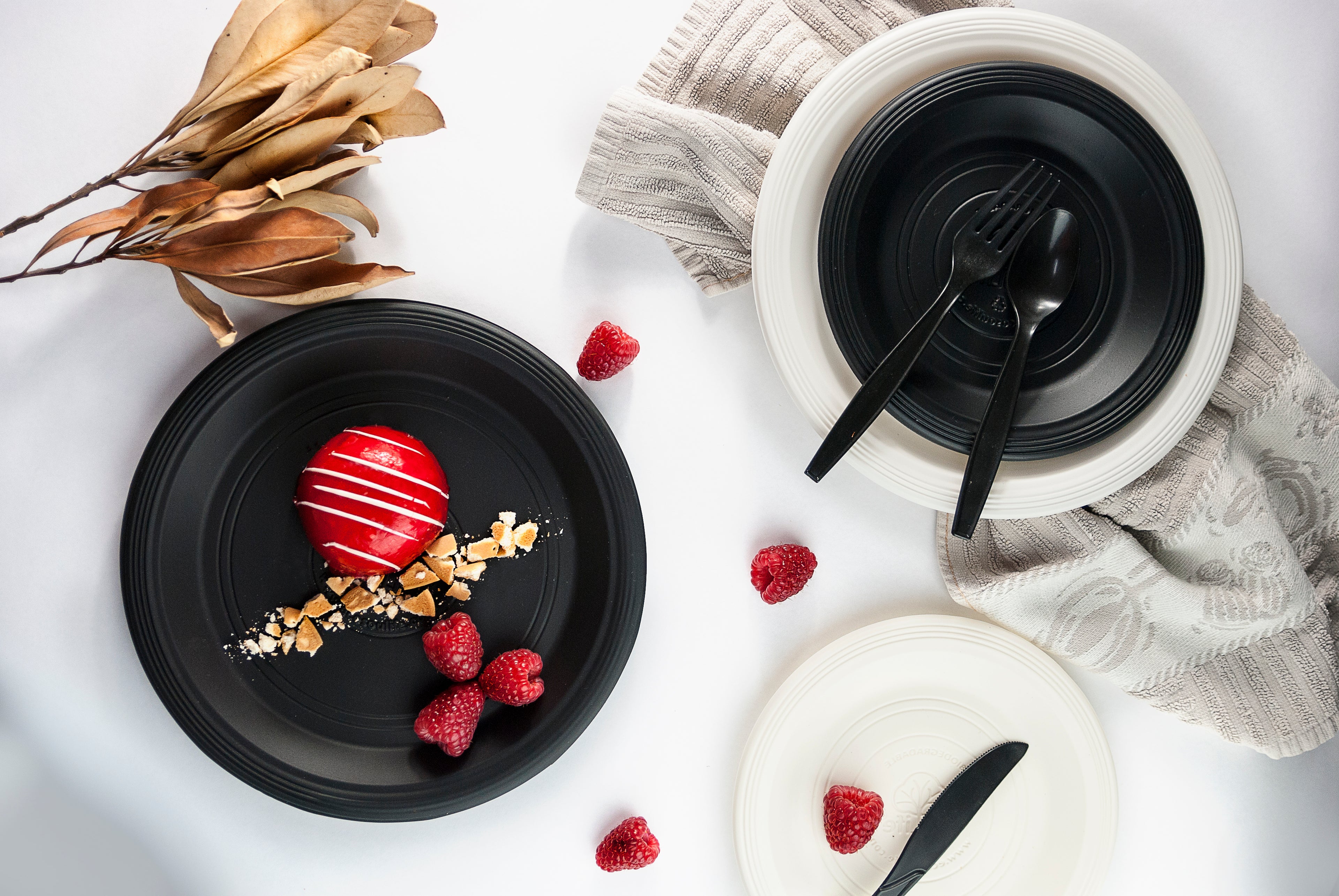 Disposable plates made of cornstarch and PP. Alternative to 100% plastic bowls.